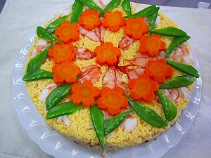 型から出して絹さやとにんじんを飾る。 |