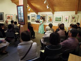 モチーフとなった「童謡」を作品の前で歌い、来場者から大変ご好評をいただきました。