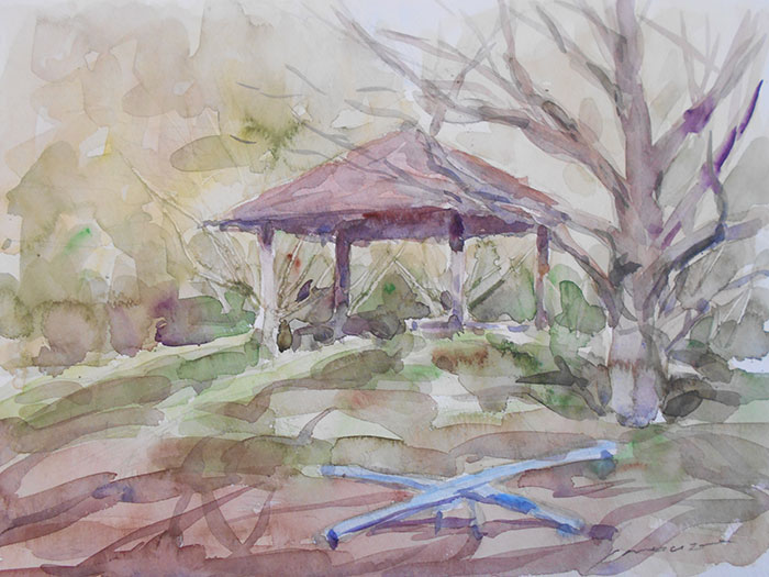 庭園の真ん中に東屋があり、これを構図の中心にしました。