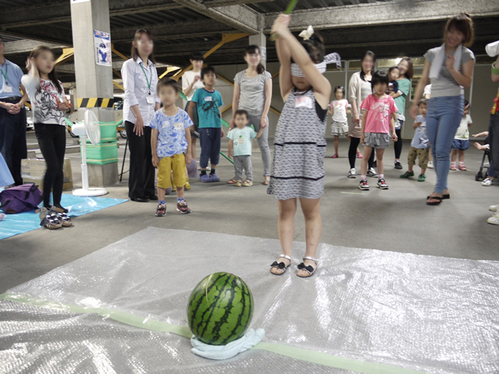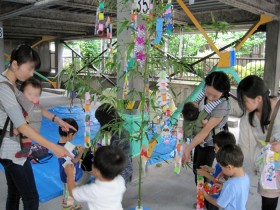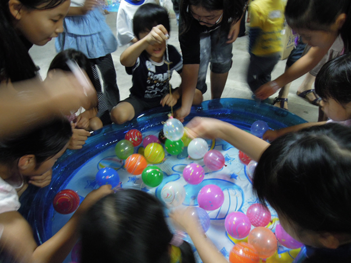 短冊にお願い事を書いて飾り付けた後は、大好評のスイカ割り、ヨーヨー釣りなどのミニゲームで盛り上がります。